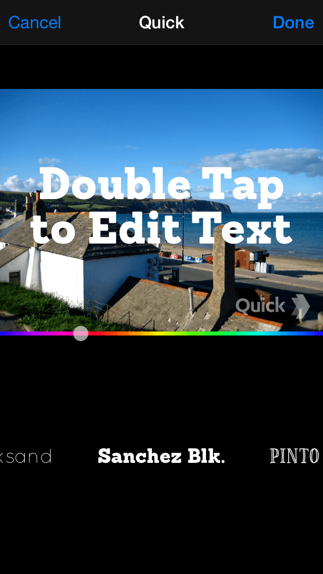 Quick is all about adding text to photos, quickly (hence the name). Select the extension and it’ll say ‘double-tap to edit text’. On editing the text, you can adjust its alignment, or you can just drag edited text around, to place it wherever you want. To choose from a number of built-in fonts, simply slide the fonts list under your image. A second slider enables you to change your text’s color.