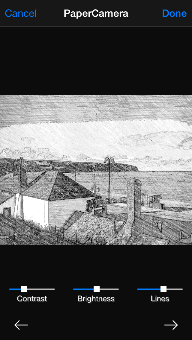 Using the two arrow buttons, you can quickly switch between a range of options that turn your photos into artwork, and the three sliders — Contrast; Brightness; Lines — enable you to fine-tune the output, often creating entirely new effects in the process. Note that the app adds a watermark; you can get rid of this in all future edits for $1.99/£1.49 in the main app.