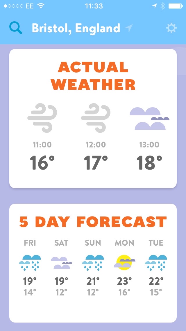Jump into the app proper and you’ll receive a humorous GIF to accompany the day’s non-sequitur. Below that you get Actual Weather – a breakdown of the predicted weather conditions over the next three hours – followed by a five day forecast, the current wind speed and a three day UV Index prediction. This is all genuinely useful stuff, presented in a clear and concise manner.