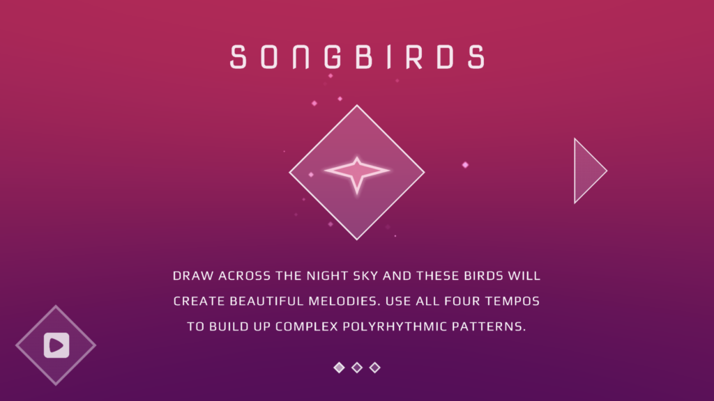 There are three main modes in Songbirds for users to choose from, and each one offers a slightly different music creation style. In the first, called “The Sky,” users are presented with four different songbirds which follow any path you draw across the sky. As the birds move along their path, they’ll sound out differently pitched notes; after sending a handful of songbirds on their flight paths, you’ll have quickly built up an uber-relaxing polyrhythmic pattern!