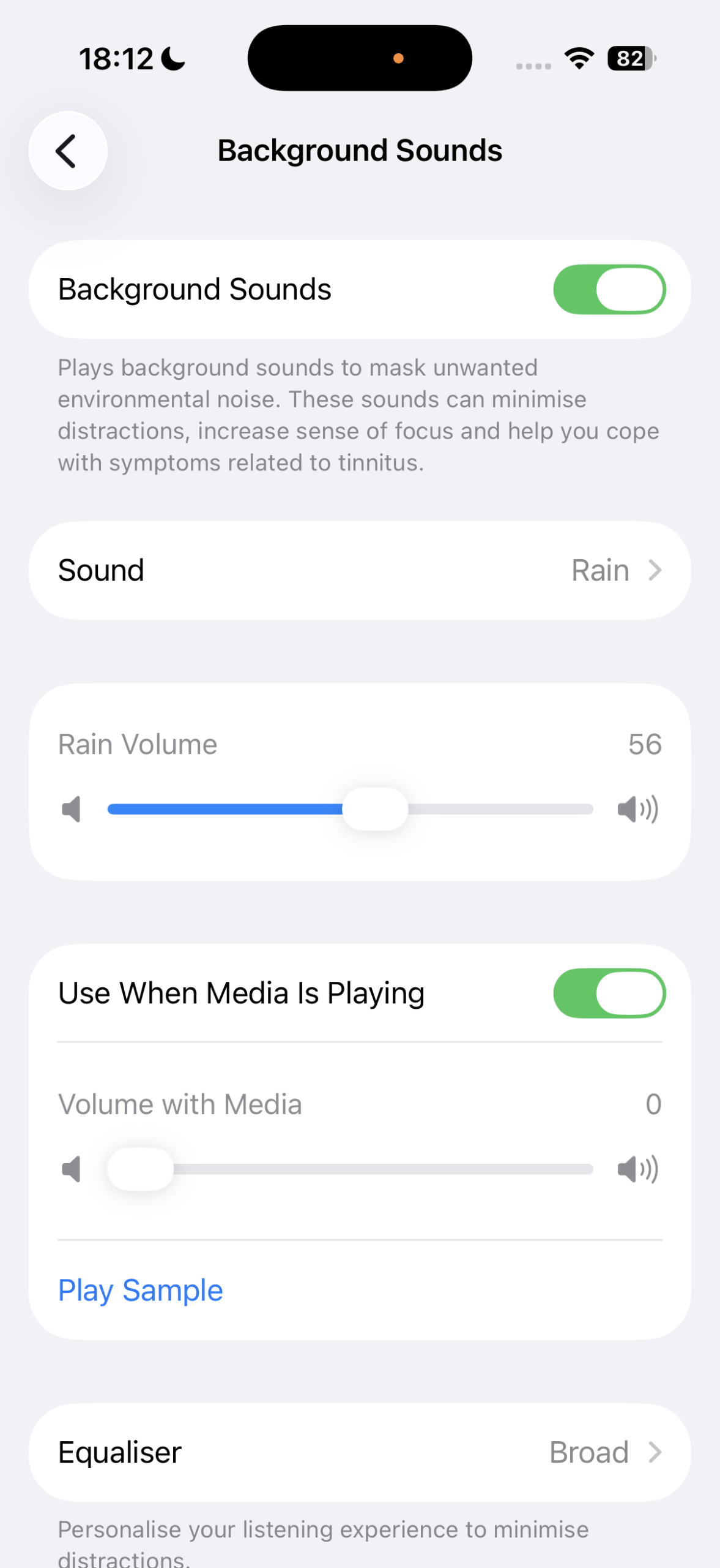 Under the Hearing section, go to Audio & Visual > Background Sounds. Turn the feature on, select a sound, and your iPhone will become an ambient noise machine. Use options to silence or lower the sound while media plays, adjust the balance (Equalizer), and stop sounds after or at a specific time.