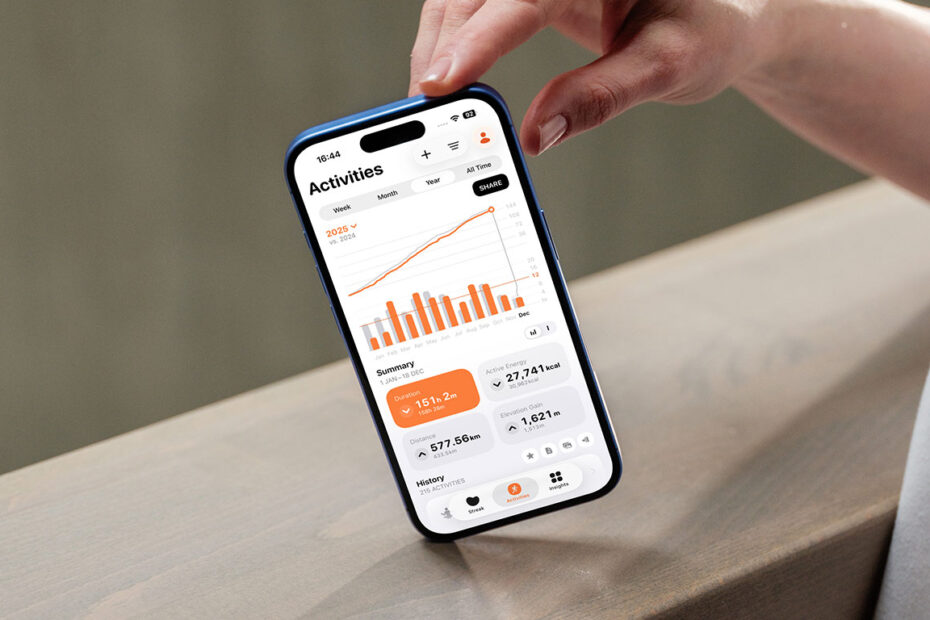 Explore trends: Back in the Activities tab, you’ll initially see a workout duration graph for the current week, comparing progress to the previous week. Summaries below let you switch the graph to show active energy, distance, or elevation gain instead. Each large button includes an arrow indicating whether you’re trending up or down week-on-week. Premium users can also explore month, year, and all-time views.