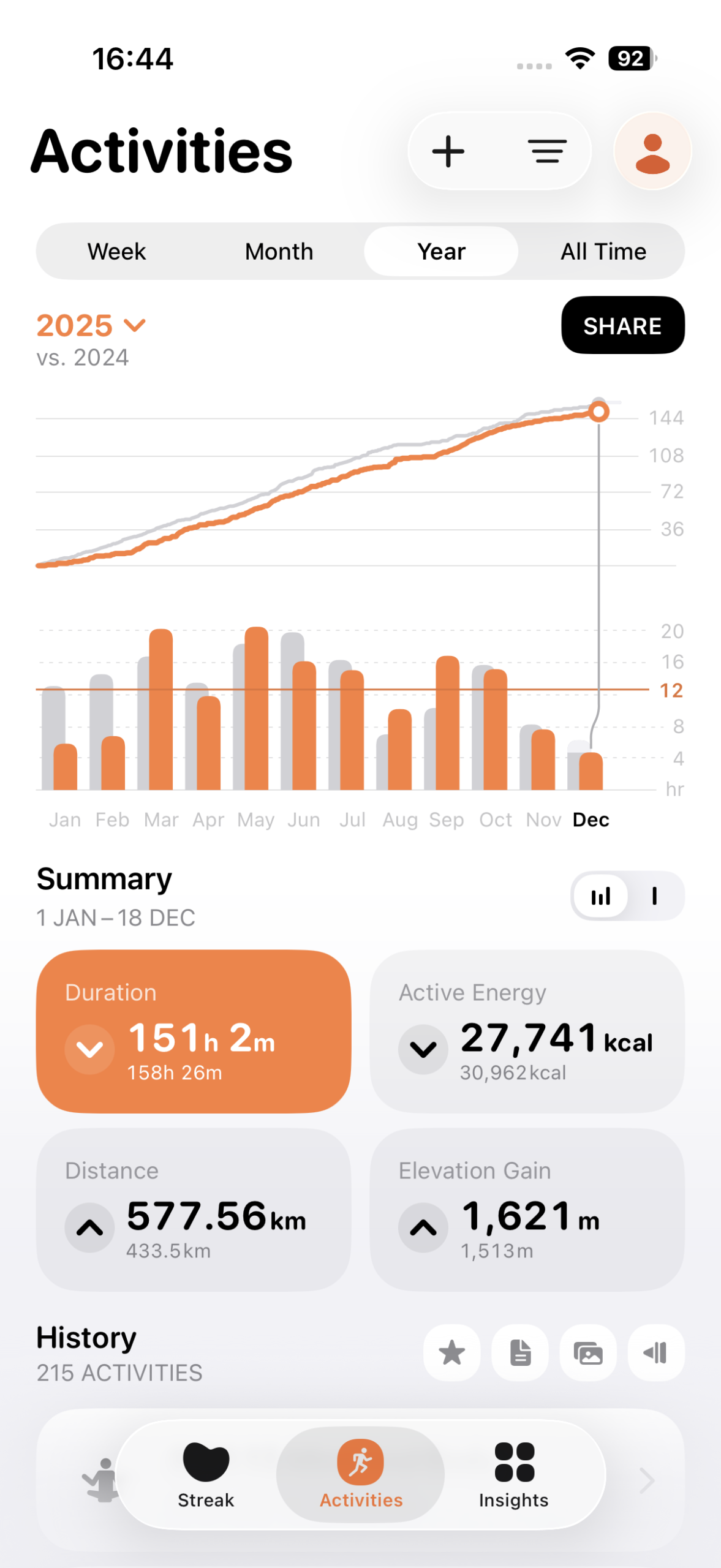 Explore trends: Back in the Activities tab, you’ll initially see a workout duration graph for the current week, comparing progress to the previous week. Summaries below let you switch the graph to show active energy, distance, or elevation gain instead. Each large button includes an arrow indicating whether you’re trending up or down week-on-week. Premium users can also explore month, year, and all-time views.