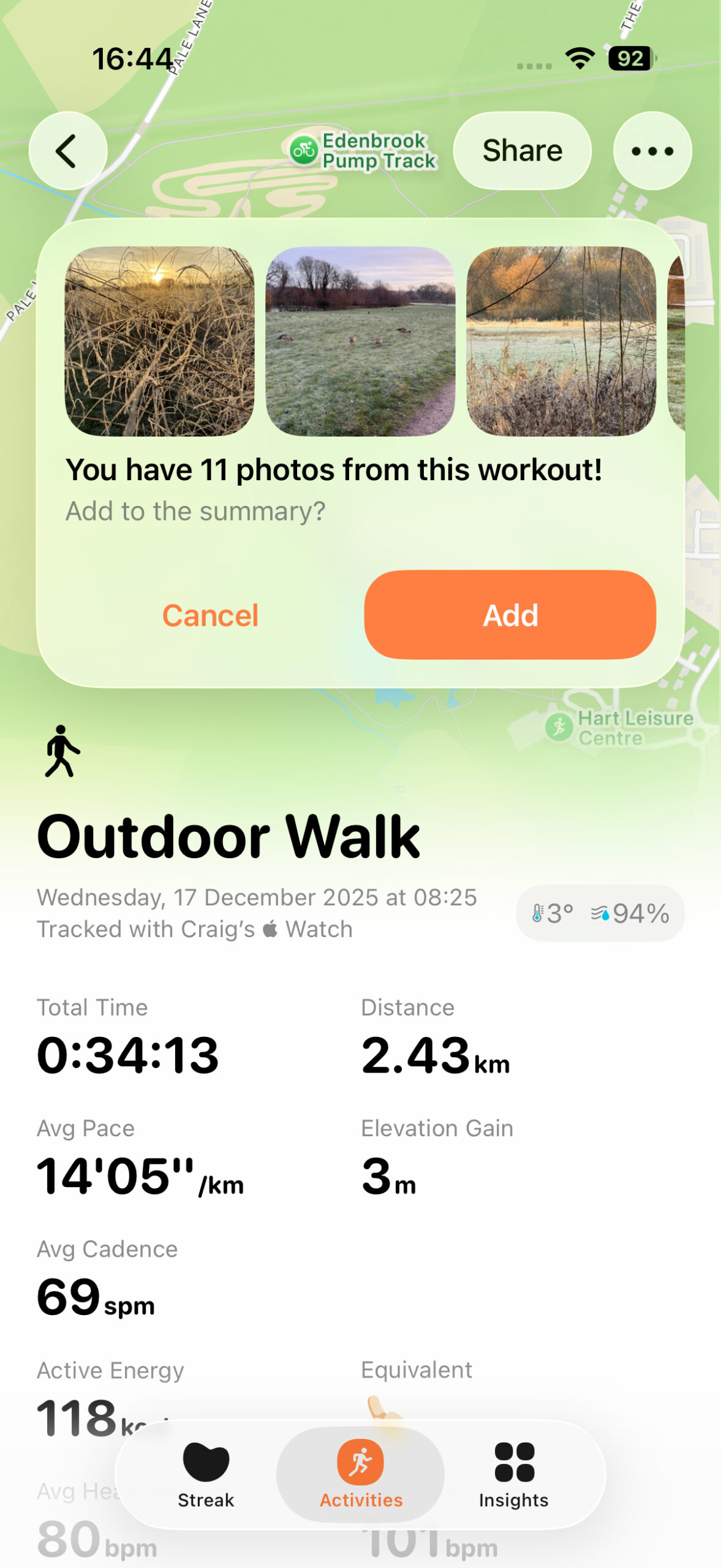 Edit an activity: For free, you can rename activities. With premium, you can flag entries as favorites, add written notes, and attach photos. When Gentler Streak finds relevant snaps in your library, it will offer to add them for you. These appear discreetly at the side of the activity view until tapped.