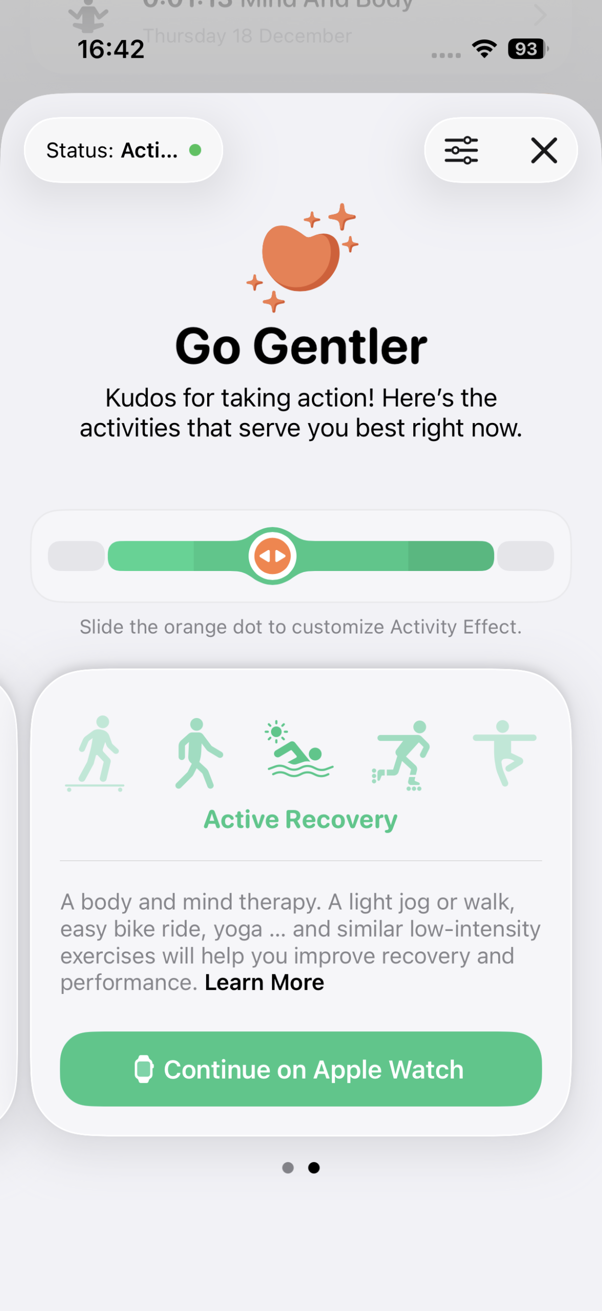 Keep stats close: Add Home Screen widgets to keep motivation, key metrics, and a button for your optimal daily action within easy reach. If you own an Apple Watch, install Gentler Streak on it for fast access to your daily condition and the ability to start workouts. And when you do start one, open the app on your iPhone and you can mirror it, which includes Live Activity support in Dynamic Island.