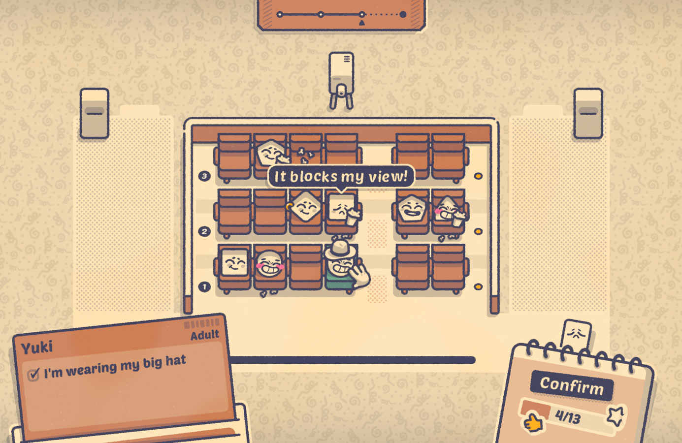 Each level layers in new rules and delightful complications. On the bus, you’ll be banishing the loud and stinky folks to the back seats, leaving nappers and window-gazers to their preferred spots. In the cinema, you’ll navigate popcorn-stealing kids, huge view-blocking hats, and short-sighted viewers who need to be up front. Reading the room is the puzzle: who sits where so that every picky preference is satisfied?