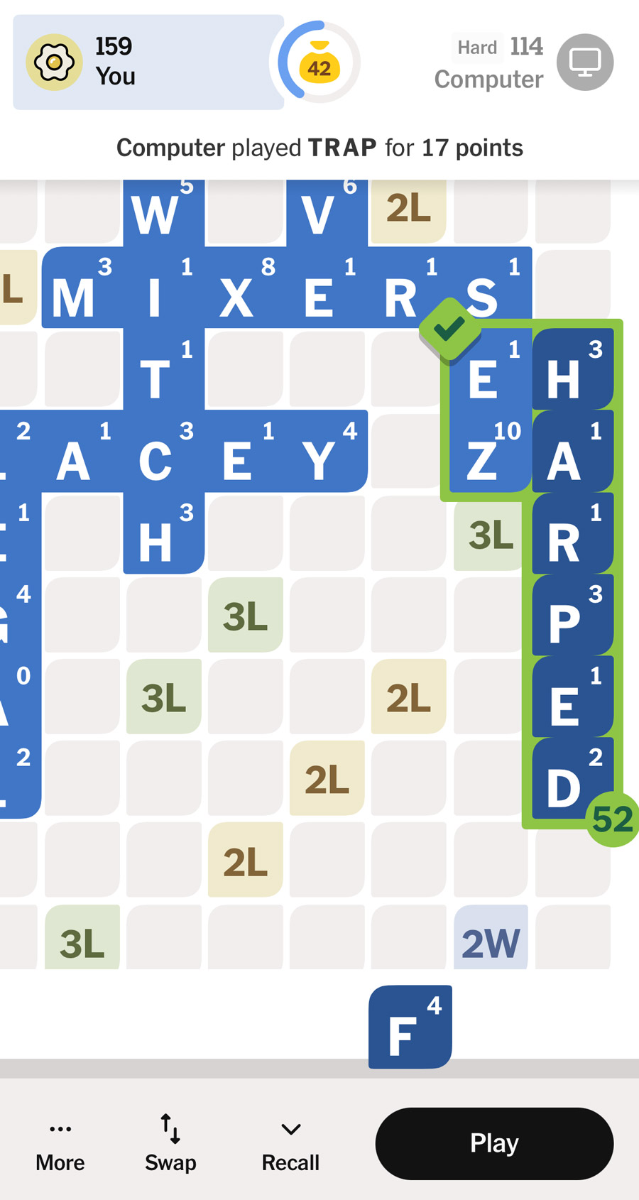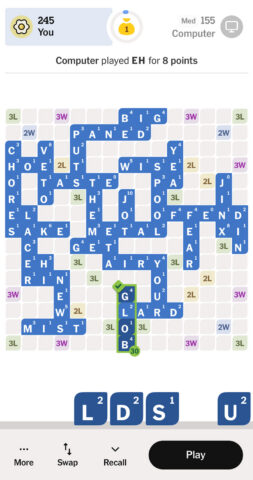Presentation is classic NYT Games, from the colors to the clean layout. My one minor gripe is that the previously played word isn’t highlighted, so it’s not always obvious what just happened on the last turn. The app tracks your stats, letting you track performance over time, and there’s a neat post-game coach called Cross Bot who reviews your play to point out better moves you missed. Oddly, that analysis doesn’t show up for CPU matches, which is a shame.