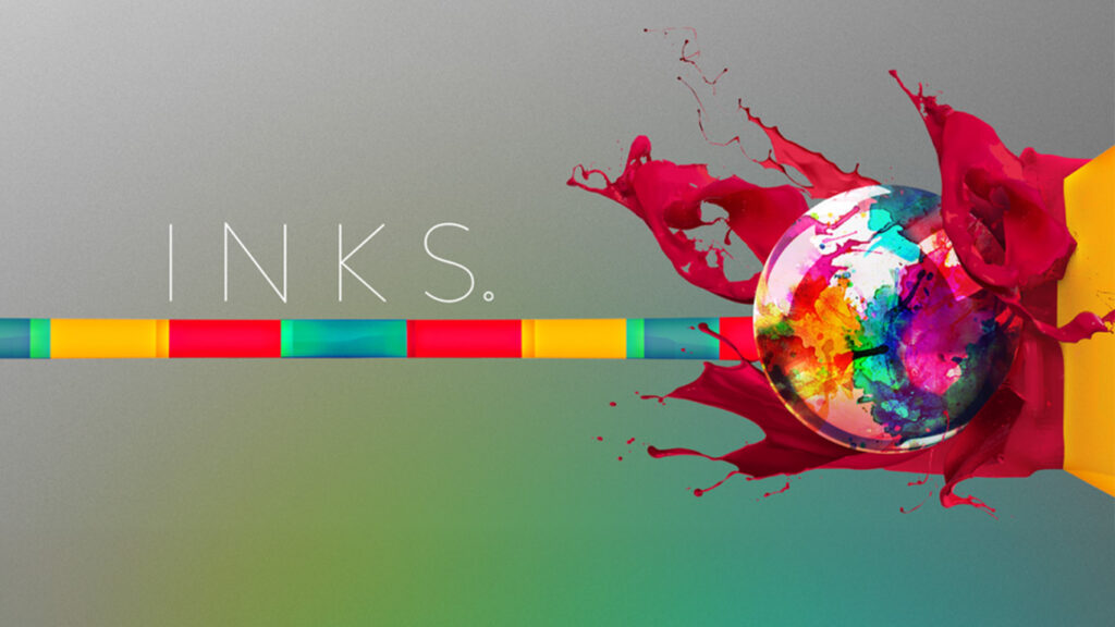 INKS, with paint splats and trails.