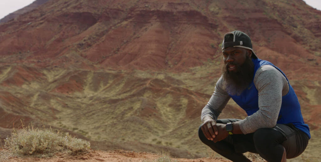 Sporting a huge beard, à la Forrest Gump, Hart straps on the Watch and then… well, keeps running.