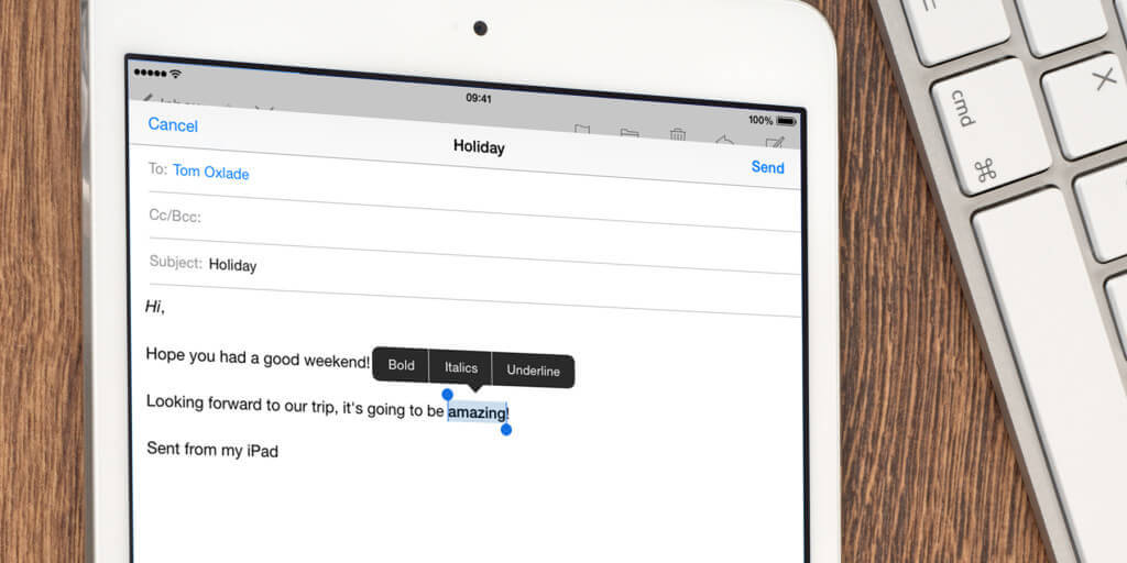 Draw attention to certain sections of your email by formatting them. Double tap a word to select it, then tap the right arrow until you find the option “BIU”. Tap this and select Bold, Italics, or Underline. If you want, you can select all three.
