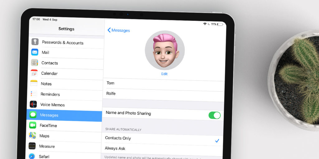 To do so, go to Settings > Messages > Share Name & Photo and flick the toggle to the on position. Now select whether you want to automatically share your name and photo with contacts, or if you want to be asked every time.