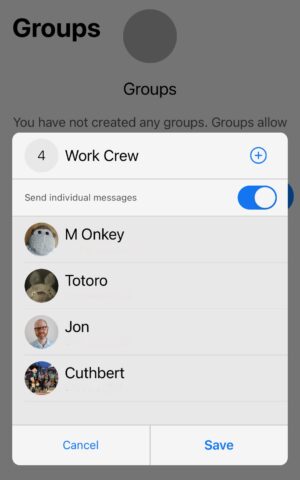 Tap the toggle button if you’d like to send scheduled messages individually rather than in a big group chat. Save the group, and it’ll be there whenever you want to set up a quick one-off scheduled message to a bunch of people at once.