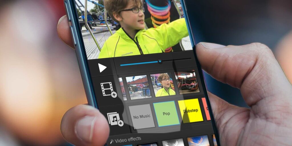 Once you’ve shot everything you need, you can trim clips, re-order them on the timeline and add effects. There are twelve transitions to choose from, as well as a stabilizer for wobbly clips and you can add a soundtrack from your Music library.